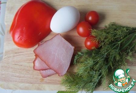 Ветчину и перец нарезаем мелкими кубиками. Помидорки разрезаем пополам.
