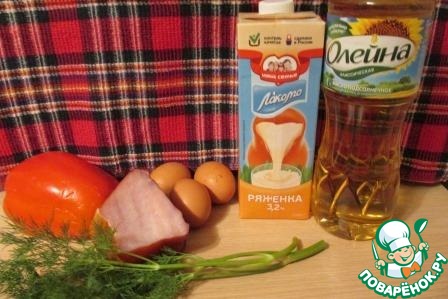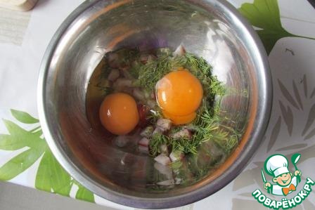 В мисочку разбиваем яйца, всыпаем кубики ветчины и нарезанный укроп.