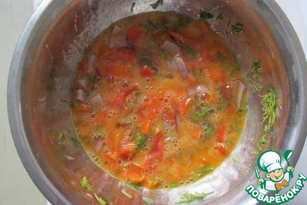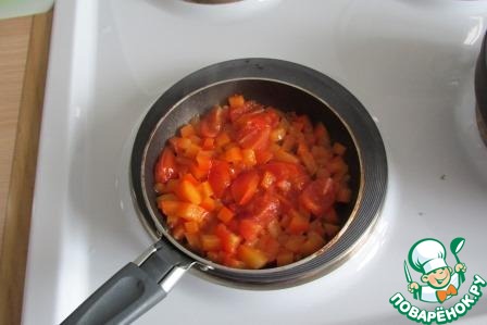 На смазанную маслом сковороду выкладываем смесь кубиков перца и кусочки помидоров, добавляем по маленькой щепотке соли и перца и тушим на среднем огне минут 10.