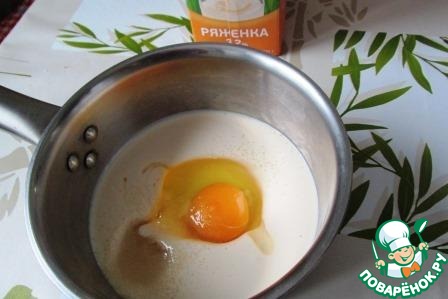 Ряженку наливаем в кастрюльку, всыпаем соль и сахар и разбиваем яйцо.