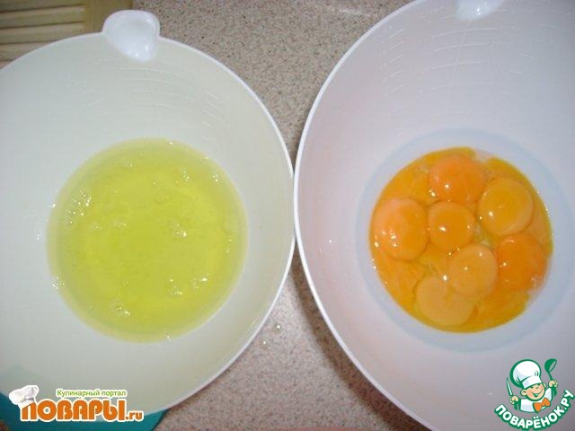 Берем 7 яиц и отделяем белки от желтков. Для белков посуда поменьше, для желтков - побольше. белки пока убираем в холодильник.