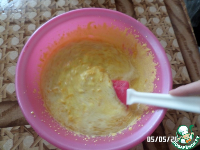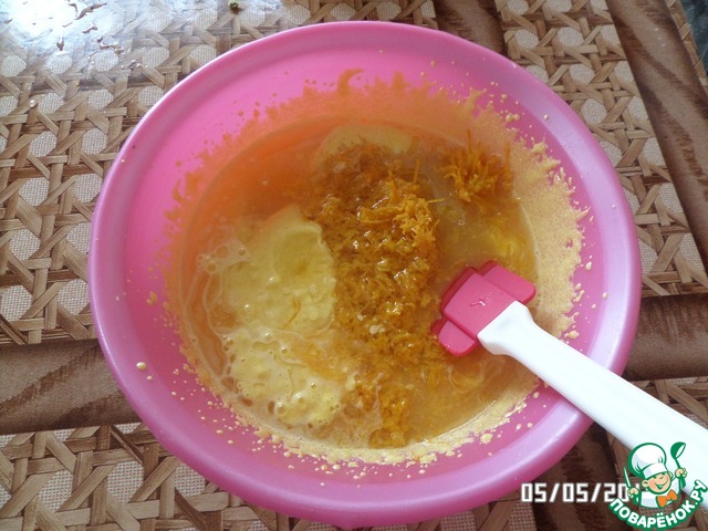 Добавляем почти полный стакан апельсинового сока, натертую цедру апельсинов и 1\4 ст. раст. масла.