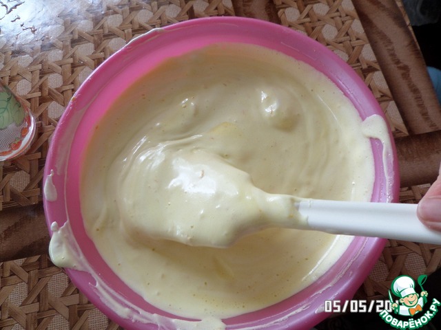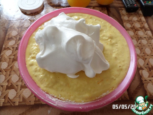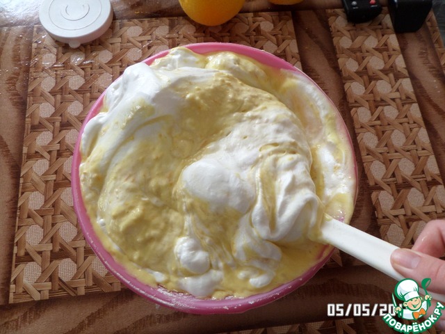 В ёмкость с желтками и всем остальным добавляем половину белков и начинаем оч. аккуратно (движениями снизу вверх, от края посуды к центру) перемешивать до однородного состояния
