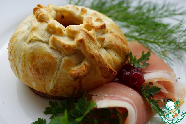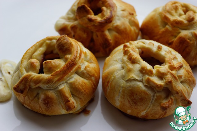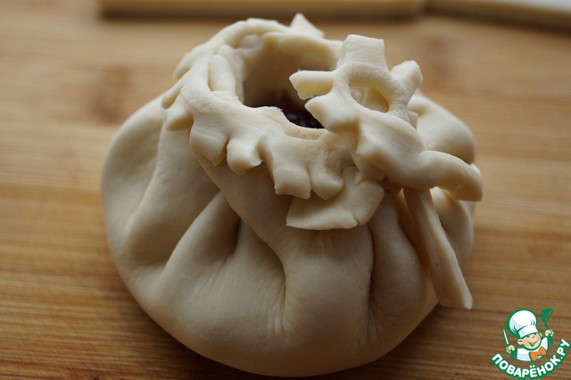 Теперь аккуратно собрать края и плотно "завязать" жгутиком слоеного теста. Защипывайте края очень аккуратно - чтобы начинка при запекании не вытекла.