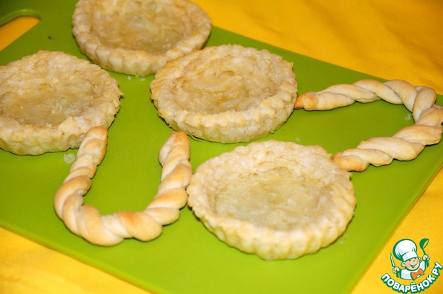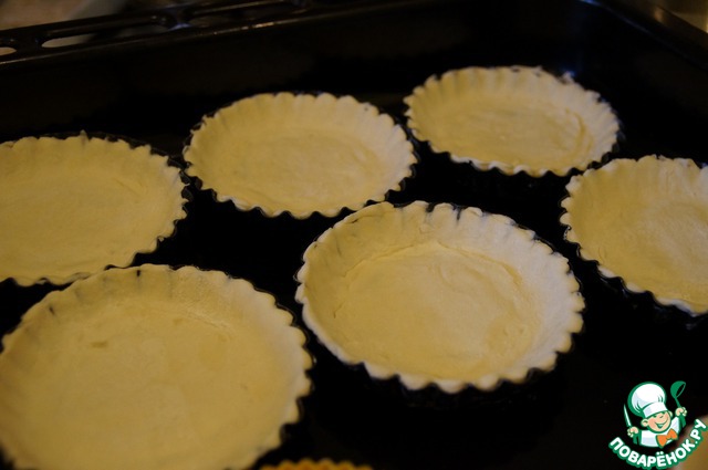 Формочки смазываем растительным маслом. Выкладываем в формочки кружки из теста. Из остатков теста делаем ручки для корзинок: Полоски теста изогнуть дугой и положить на противень. Отправляем все в духовку разогретую на 200 градусов на 10-15 минут.