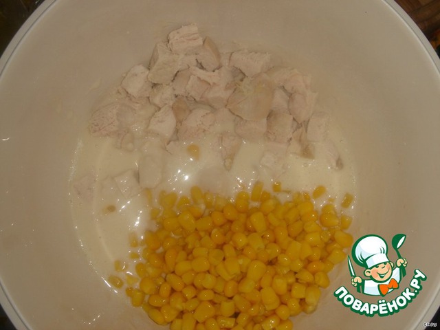Введите в тесто курицу и кукурузу. Приправьте перцем по вкусу.