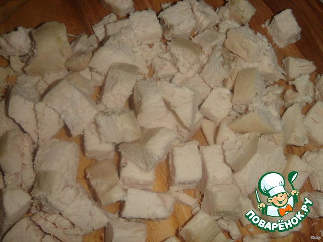 Отваренное куриное мясо порежьте кубиками.