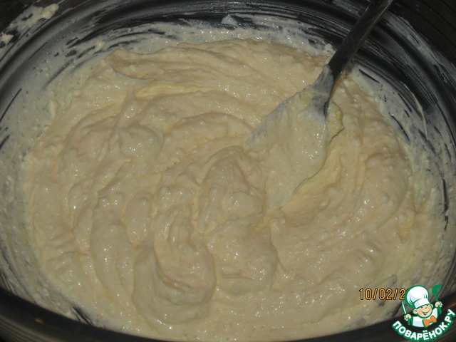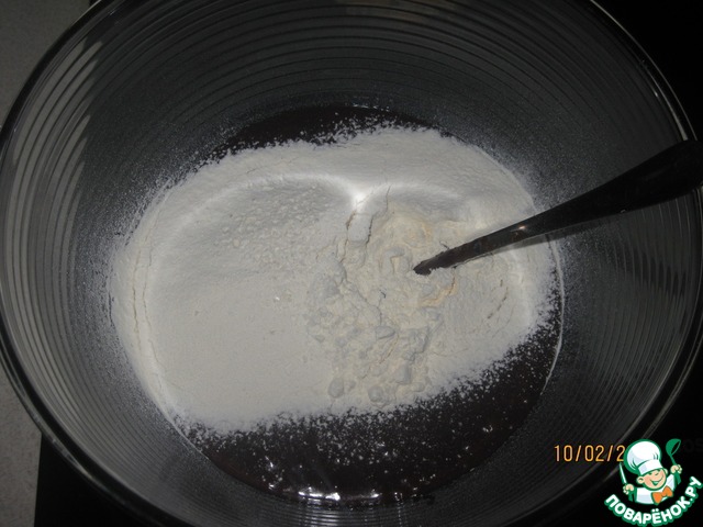 Добавляем просеянную муку, соль, разрыхлитель и соду. Перемешиваем до однородного состояния.