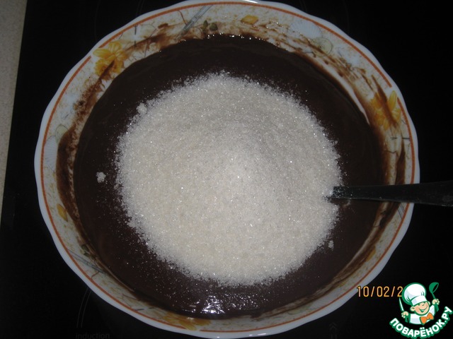 В шоколадно-масляную массу добавляем 3 яйца и оставшийся белок. Перемешиваем.