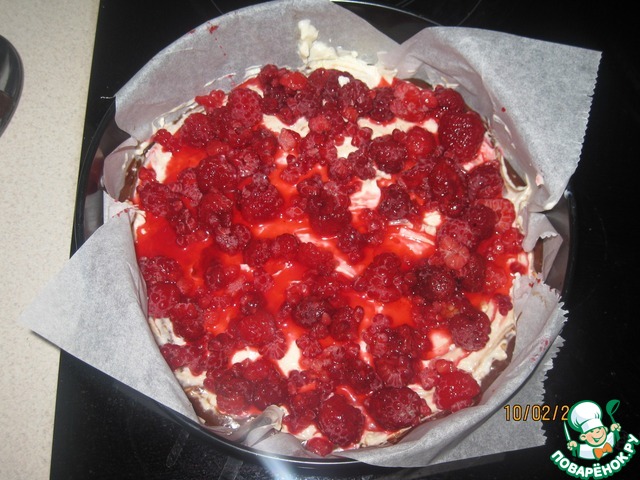 Разравниваем. Поверх сливочного слоя выкладываем малину (грамм 180, остальная пойдет на украшение)...