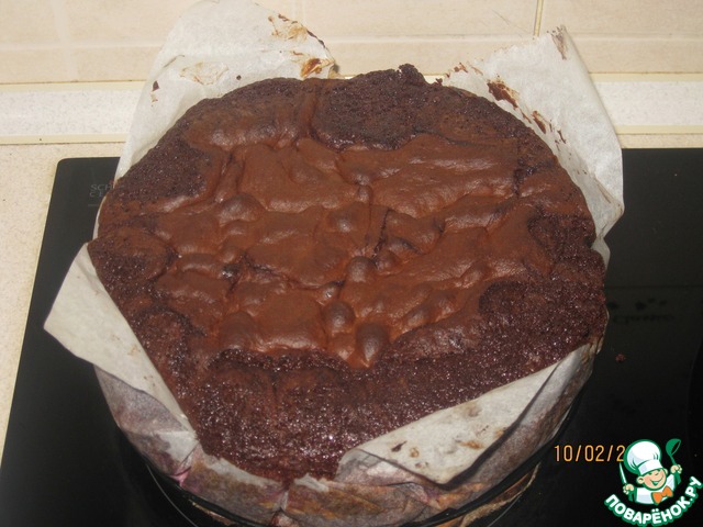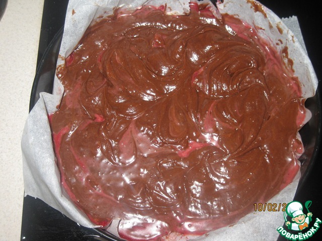 Форму для выпекания (24 см) застилаем пергаментом. Выливаем 1/2 часть шоколадного теста. Сверху выкладываем всю сливочную массу.