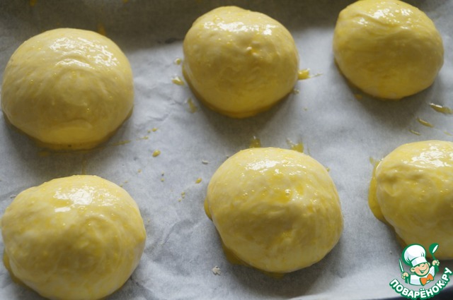 Разделать тесто на одинаковые кусочки, у меня булочки получились около 100 г 1 штука. Всего булочек у меня вышло 11 шт. Скатать кусочки в шарики и выложить на противень застеленный пергаментом. Смазать пончики взбитым яйцом.