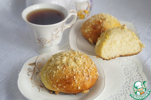 Посыпать булочки штрейзелем и дать расстояться 20-30 минут. Выпекать в разогретой до 180 гр. духовке минут 20 до золотистой корочки.