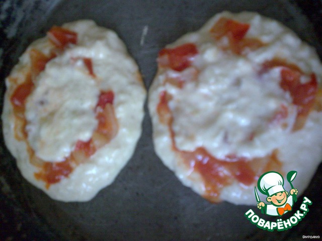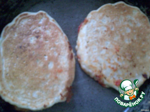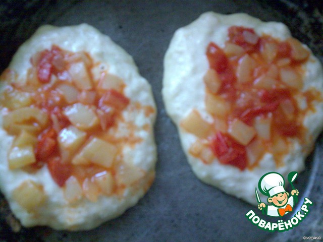 Ложкой выливать тесто на сковороду, сверху выложить смесь обжаренных овощей.