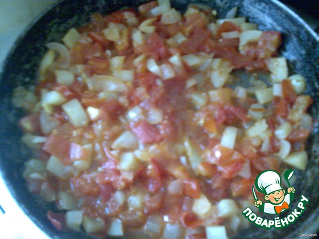 Лук, перец, помидор обжарить на подсолнечном масле.