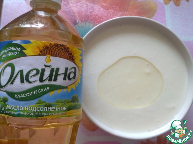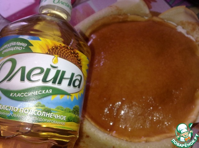 Для приготовления блинов делаем тесто по любому рецепту, c добавлением растительного масла ТМ "Олейна".