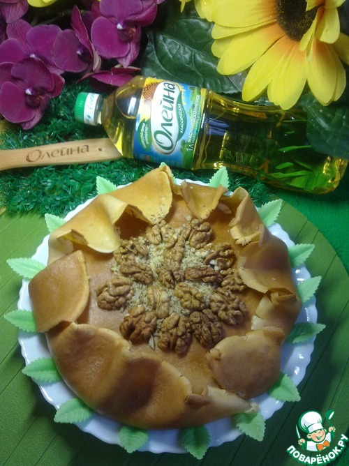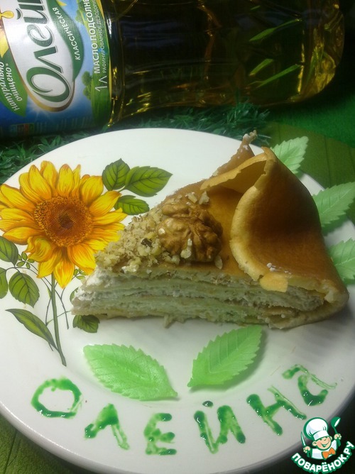 Продолжайте выкладывать блины, чередуя их с творожно-ореховой начинкой. (У меня получилось три слоя начинки). Закончите выкладку блином, смажьте его обильно подсолнечным маслом ТМ "Олейна".