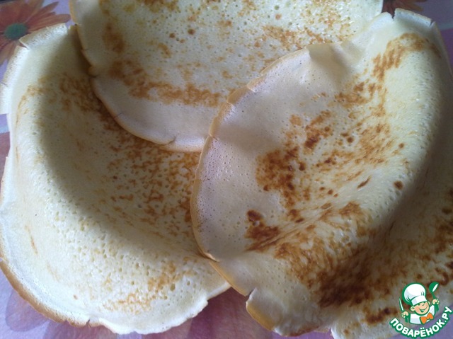 Выложите на дно 3 блина внахлест, их края должны выходить за края формы.