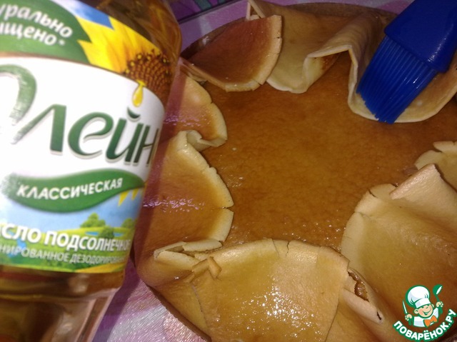 Накройте свободными краями первых трех блинов, снова смажьте подсолнечным маслом ТМ "Олейна".