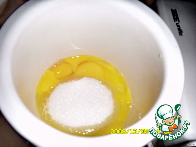 Яйца взболтать с сахаром и солью, влить в муку с опарой и перемешать.