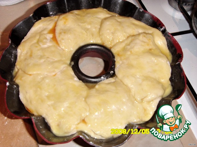 К тыквенному пюре[url]http://www.povarenok.ru/recipes/show/12738/[/url] добавить по вкусу сахар,ваниль.Рабочее место подсыпать мукой и руками брать маленькие кусочки теста,формировать ввиде лепешки,положить начинку и укладываем друг на дружку по кругу в форме-венок. Форму смазать маслом и посыпать мукой.