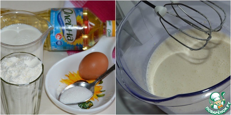 Замесить тесто на блинчики. Вы можете сделать тесто по своему любому и проверенному рецепту, а можете, как и у меня. У меня тесто из самоподнимающейся муки. Молоко я слегка подогреваю, примерно до 40 градусов. Миксером смешиваю молоко, муку, сахар, яйцо. При замесе в тесто добавляю 2 ст. л. растительного масла.