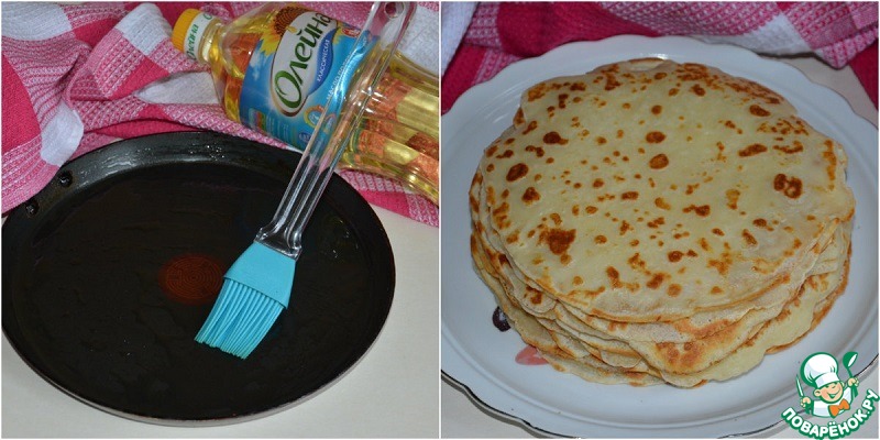 Перед первым блином я немного промазываю сковороду растительным маслом. Далее смазываю по мере необходимости, но как правило такой необходимости далее не возникает.