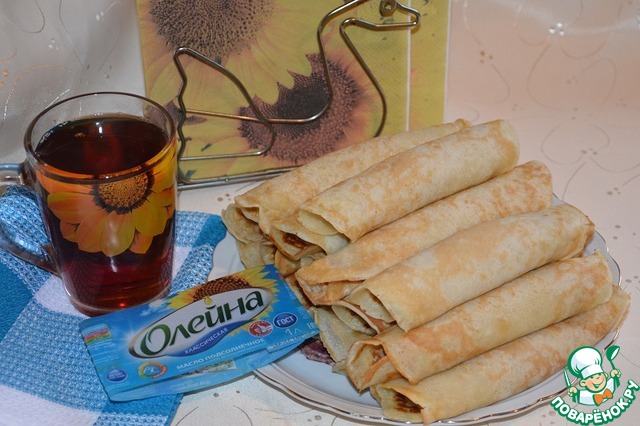 На каждый блин выложить 1-2 ст. л. начинки. И с помощью лопаточки или широкого ножа размазать начинку по всей площади блина. Затем я промазанные блинчики сворачивала трубочкой.
