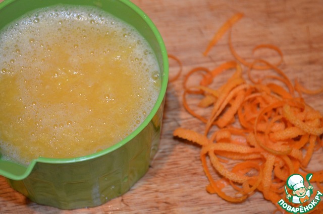 Апельсины тщательно моем, снимаем цедру и выжимаем сок вместе с мякотью.
