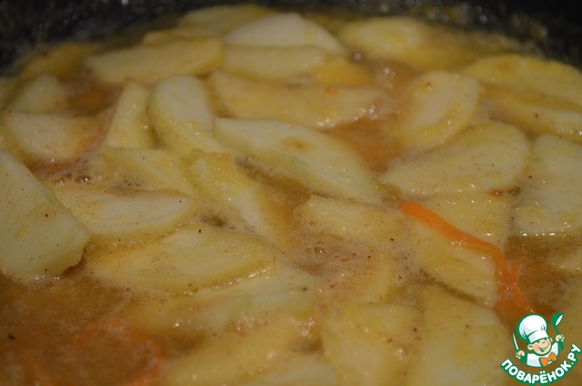 Яблоки моем, чистим, удаляем сердцевину и режем тонкими пластинами. Когда соус закипит яблоки и корицу выкладываем в сковороду, перемешиваем и готовим 3-5 минут. Яблоки должны стать мягкими, но не превраться в пюре.