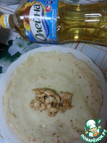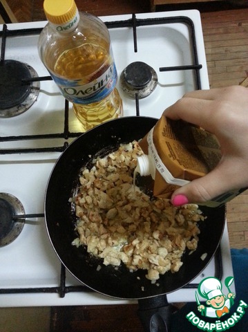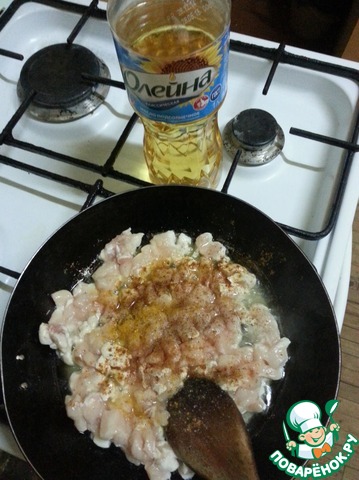Куриную грудку нарезать на маленькие кусочки, добавить куркуму, посолить, поперчить и обжариваем