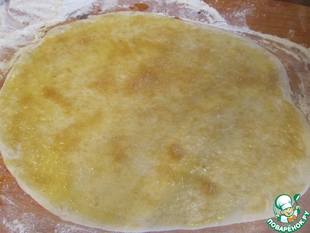Каждую часть раскатать в прямоугольный пласт. смазать растопленным сливочным маслом и посыпать сахаром.