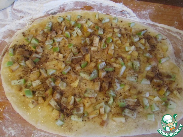 Подготовить начинку. Яблоки и айву порезать кубиками.