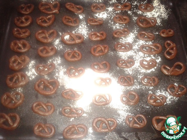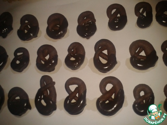 Каждый кренделек окунаем в шоколад и кладем на бумагу. Ту часть, за которую мы держали аккуратно посыпаем сахарной пудрой.