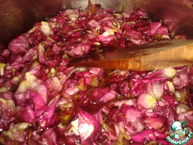 Из воды и сахара сварить сироп. Прокипятить 3-4мин. Дать чуть остыть, затем поместить в сироп лепестки, растереть хорошенько, накрыть пищевой пленкой и убрать в холодильник на 8 часов. По истечении этого времени процедить сироп и добавить сок лимона. Итак, сироп готов.