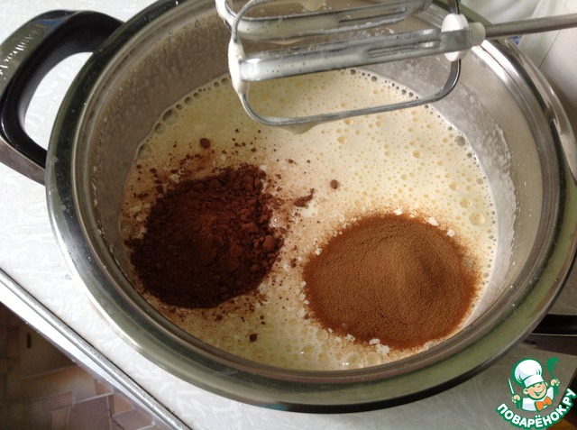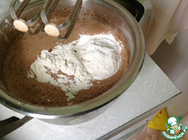 Добавляем растопленое масло, муку и разрыхлитель перемешиваем