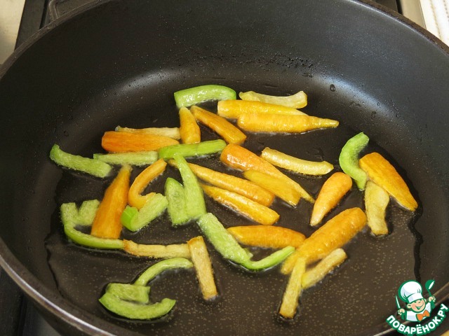 Морковь (у меня молоденькая замороженная) и болгарский перец обжариваем около 7 минут.