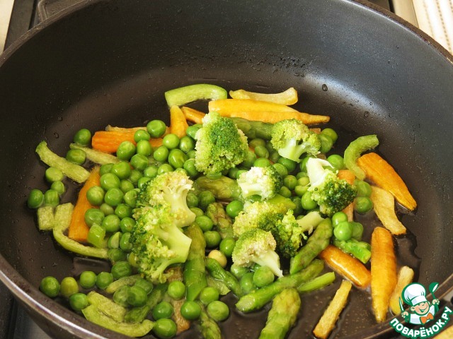 Все овощи у меня замороженные, для начала их размораживаем. Зелёный горошек, брокколи, спаржу отвариваем в подсоленной воде 5 минут.
