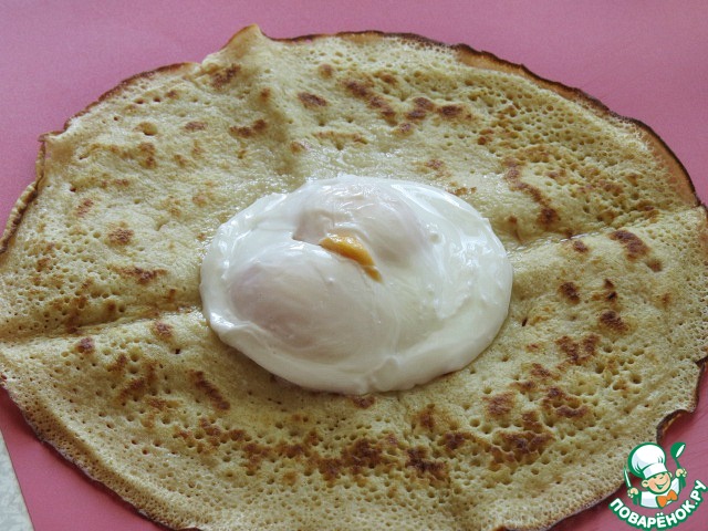 Готовое яйцо-пашот заворачиваем в блин, закрепляя мешочек колечком от лука.