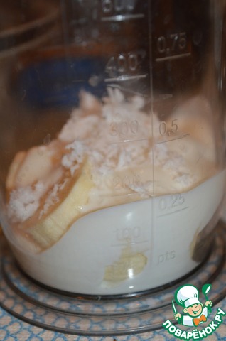 Для тропического соуса смешать йогурт, банан и кокосовую стружку и все пробить блендером.