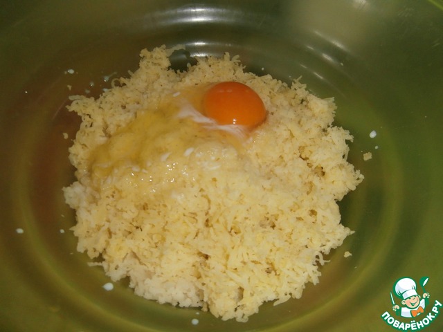 Смешываем картофель, сыр с чесноком. Добавляем яйцо и молоко. И тщательно перемешиваем.