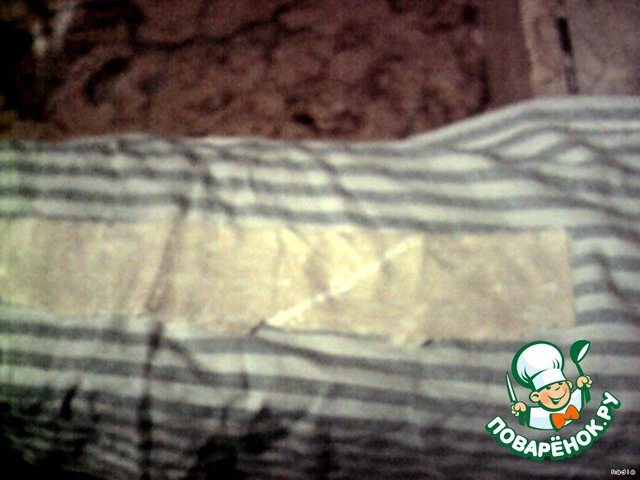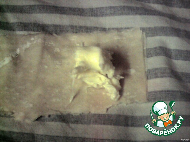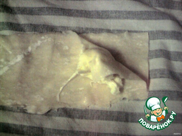 Тесто размораживаем или готовим сами http://www.povarenok.ru/recipes/show/6407/ Нарезаем полосами шириной 5-6 см, отделяем пласты теста (работать надо быстро, так как тесто очень легко засыхает и неиспользуемое тесто лучше держать в пакете).