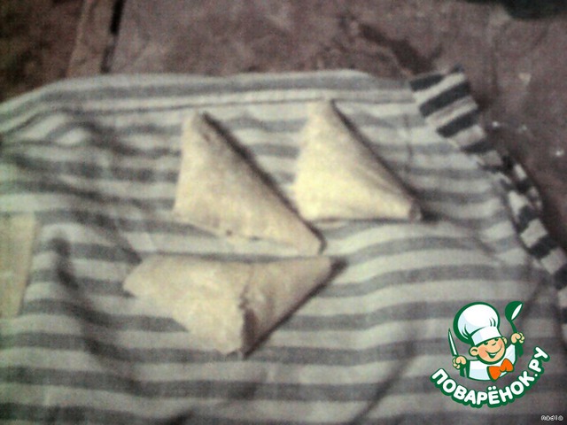 Кладем сыр на конец пласта и закрываем уголком так, чтобы получился треугольник.