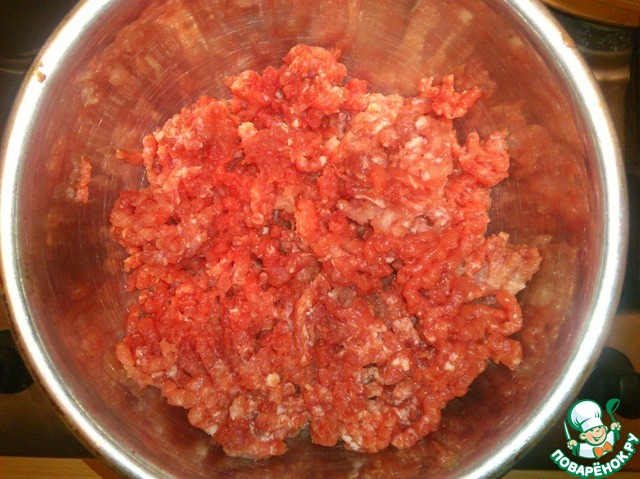 Мясо прокрутить на мясорубке с мелкой решеткой
