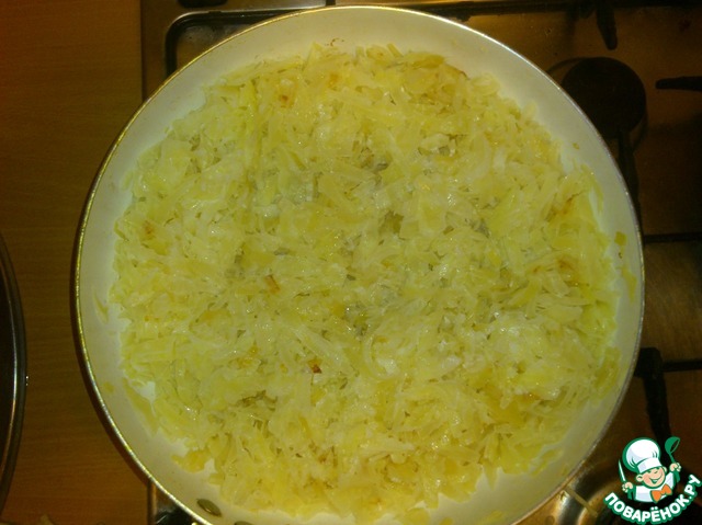 Капусту откинуть на сито, дать стечь лишней жидкости. Добавить ее в сковороду с луком и обжарить до мягкости