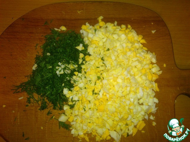 Соединить вместе капусту с луком, обжареный фарш, яйца и зелень. Добавить в начинку соль (по вкусу) и свежемолотый черный перец