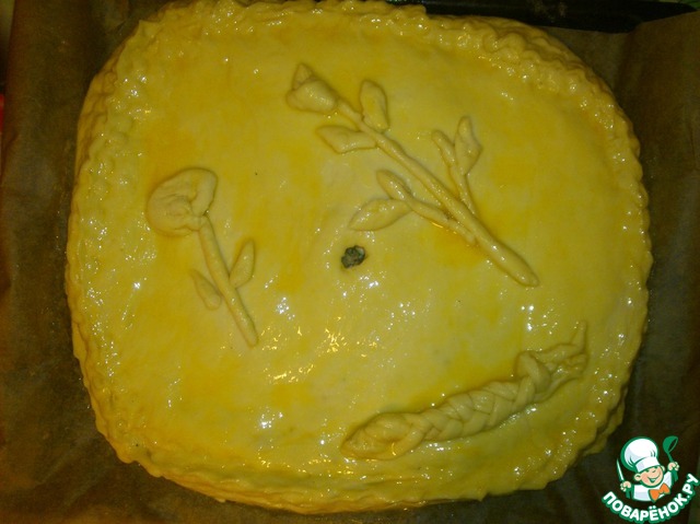 Выпекать всю эту красоту в духовке при 180С около 45 минут до золотистого цвета. Готовый пирог смазать сливочным маслом.
