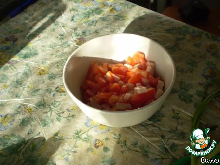В это время готовим начинку для наших гнездышек. Режем кубиками ветчину и помидоры.