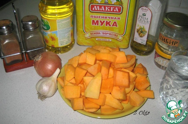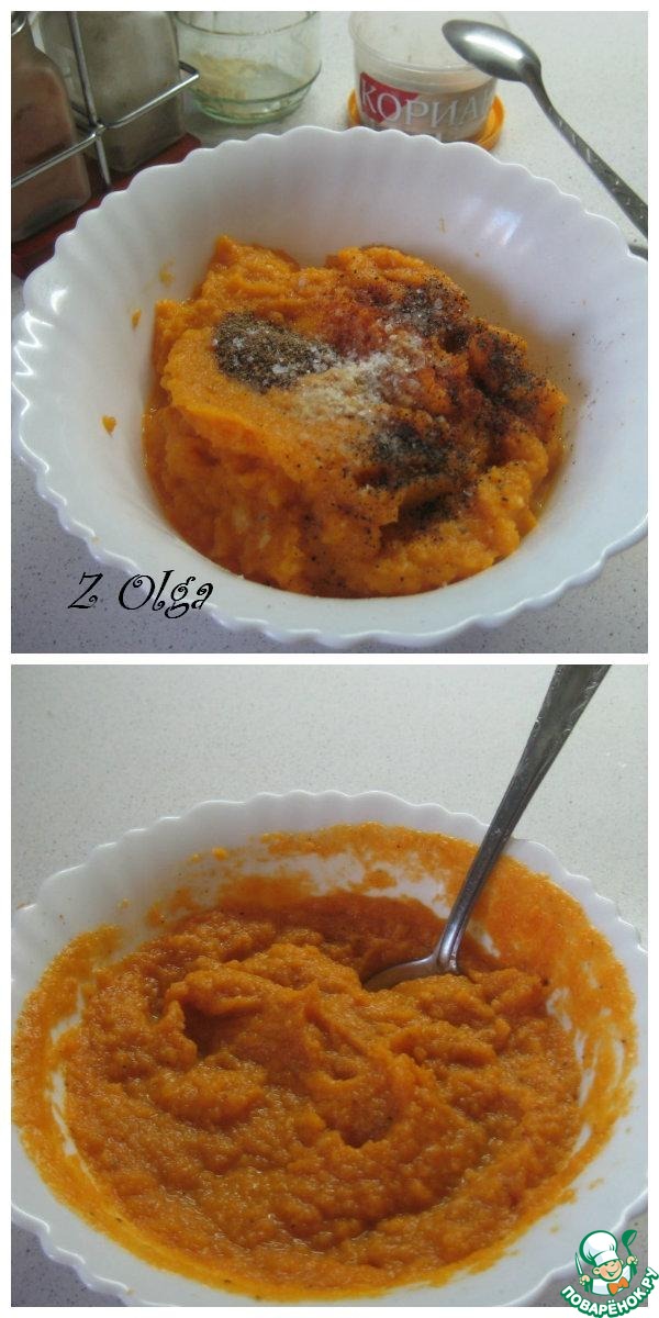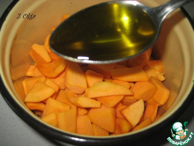 Пока тесто отдыхает, займемся начинкой. Тыкву нарезать небольшими кусочками, сложить в кастрюльку с толстым дном, добавить оливковое масло. На небольшом огне протушить тыкву с маслом до мягкости.