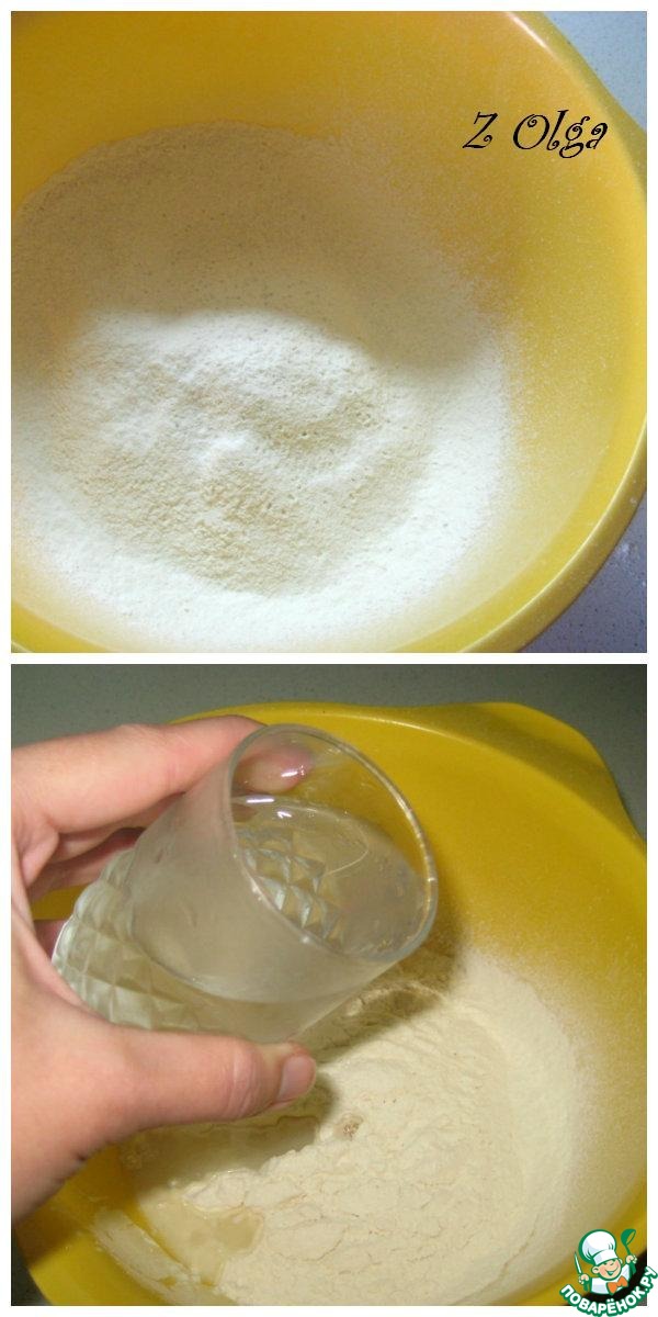 Начинаем с теста. Просеиваем муку с солью. Постепенно начинаем вливать холодную воду, замешивая тесто. Добавляем оливковое масло.